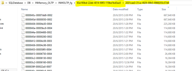 A memory-optimized file group internally uses filestream files to store inserted and deleted rows for in-memory tables. There are two types of files. A data file contains inserted rows while a delta file contains deleted rows. Each data file is pre-allocated to a size of 128 MBs but can get larger if there is a long running transaction or when a manual merge forces the resultant target file to be larger than 128MB.These files are also called checkpoint files and they come in pairs of DATA and DELTA.